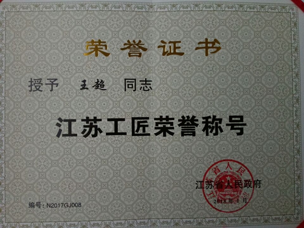 蘇舜公司王超同志榮獲江蘇工匠榮譽稱號