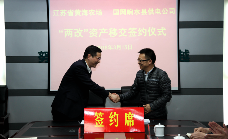 為貫徹落實國家和省委省政府及集團公司黨委關于加快推進農場電力改造工作一系列決策部署,加快推進黃海電力“兩改”工作。315日,黃海農場與國網響水縣供電公司電力“兩改”資產移交簽約儀式在響水縣供電公司舉行,標志著黃海電力“兩改”工作取得突破性的積極進展,進入職能接收、維修改造的實戰階段。黃海農場黨委書記王亦勤、場長單祥忠、副場長薛亞林,響水供電公司黨委書記楊浩天、副總經理沈曉東、王春雨共同出席簽約儀式。農場和縣供電公司相關部室負責人參加了簽約儀式。