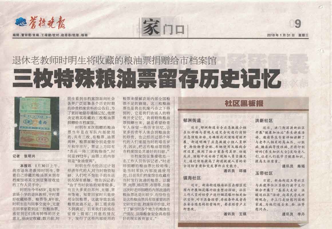 日前,《蒼梧晚報》在三版頭條位置刊登了《三枚特殊糧油票留存歷史記憶》的新聞報道,主要講述了東辛農場退休老教師將自己珍藏多年文革期間的糧油票捐贈給連云港市檔案館的先進事跡。
