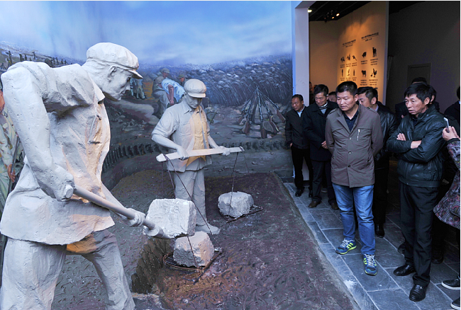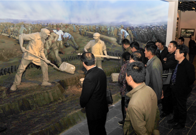 在新征程中勿忘“大鍬、扁擔(dān)”,就是要求我們要接過(guò)軍墾先輩們的精神接力棒,以腳踏實(shí)地的干勁,以舍我其誰(shuí)的擔(dān)當(dāng),來(lái)為了讓更多的職工群眾能過(guò)上美好幸福生活的向往。特別是在時(shí)下廣泛開(kāi)展的“不忘初心、牢記使命”的主題教育中,更需要我們深入貫徹黨的十九大精神,牢固樹立以人民為中心的思想,一切為了人民,一切依靠人民,唯有這樣,我們才能在新征程的道路上,無(wú)往而不勝。圖為客人們?cè)谵r(nóng)建四師陳列館中觀看以江希友和仇泉原型創(chuàng)作的“江大鍬”和“仇大筐”雕塑模型。