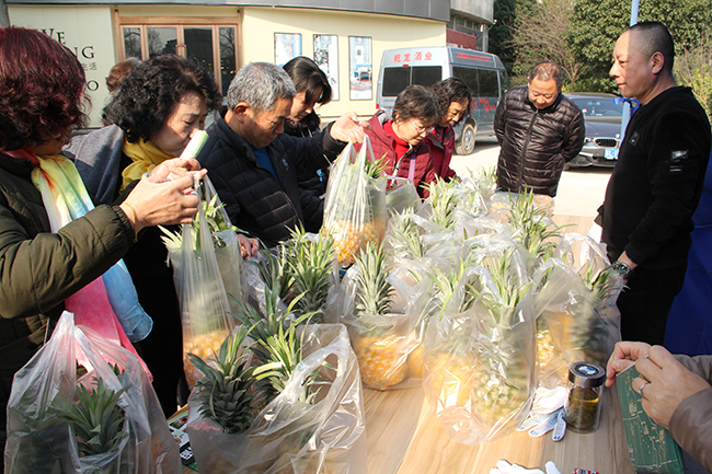 各攤位前人頭攢動,爭相搶購,“老知青”香粳米、葵王油、海天系列產品、江心沙皓明系列大米菠蘿最搶手,人們買米、買油、買菠蘿,拎著沉甸甸的收獲,臉上笑開了花。