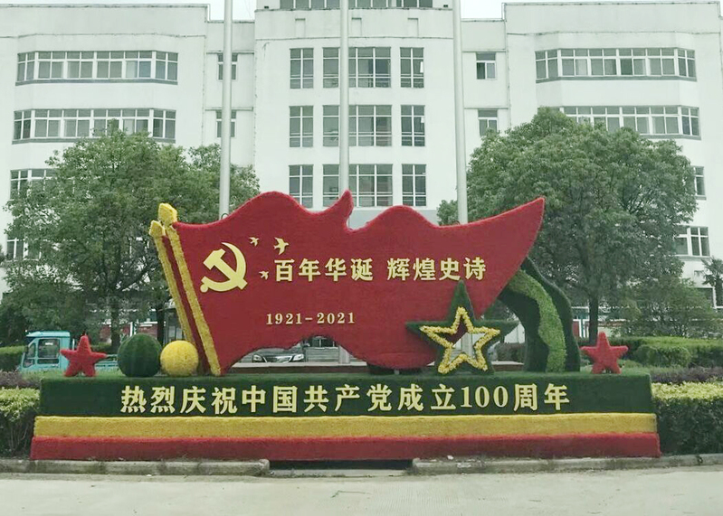 早在5月份,一組熱烈慶祝中國共產黨成立100周年的綠雕就將辦公樓前的花壇裝點一新。根據慶祝建黨100周年氛圍營造方案,近期,施工人員抓緊對350省道小城鎮段、裕源大道、建場路的燈桿上安裝印有“中國夢”字樣的中國結景觀燈,同時穿插“不忘初心,牢記使命”、“砥礪奮進,追夢前行”、“聽黨話,跟黨走”以及企業精神的道旗和宣傳標語等,營造出一派紅色、熱烈、喜慶、向上的濃厚氛圍。