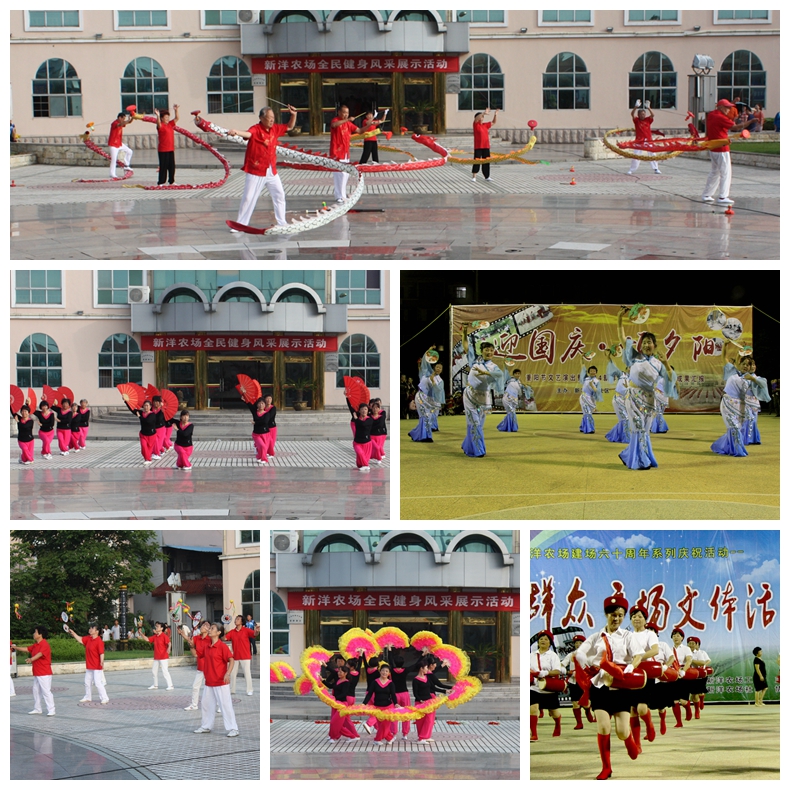 為了滿足退休職工的文化生活的需要,農(nóng)場建起了文化活動(dòng)中心、文體活動(dòng)廣場和居家養(yǎng)老服務(wù)中心,各個(gè)住宅區(qū)都有一定的活動(dòng)場所,老年人在這里參與打腰鼓、擊劍、扇子舞、抖空竹、太極拳、佳木斯快樂舞步等各種活動(dòng),鍛煉身體,愉悅心情。農(nóng)場成立了書法攝影協(xié)會(huì)、讀書協(xié)會(huì)、象棋協(xié)會(huì)、舞蹈協(xié)會(huì)、抖空竹協(xié)會(huì)、門球協(xié)會(huì)等群眾文化團(tuán)體,很多老年人參加了協(xié)會(huì),有的還成為協(xié)會(huì)的骨干,他們?cè)趨f(xié)會(huì)里發(fā)揮自己的聰明才智,尋找到各自的樂趣,給協(xié)會(huì)增添了活力。農(nóng)場經(jīng)常組織各種文體活動(dòng),很多老年人與年輕人同臺(tái)表演,不少人表現(xiàn)不凡,贏得滿堂喝彩。豐富多彩的文化生活,使新洋的老年人煥發(fā)了青春。有關(guān)協(xié)會(huì)經(jīng)常選派選手參加集團(tuán)公司和省、市、縣舉辦的攝影、書法、舞蹈、門球、抖空竹、象棋等比賽,總能取得較好的名次。