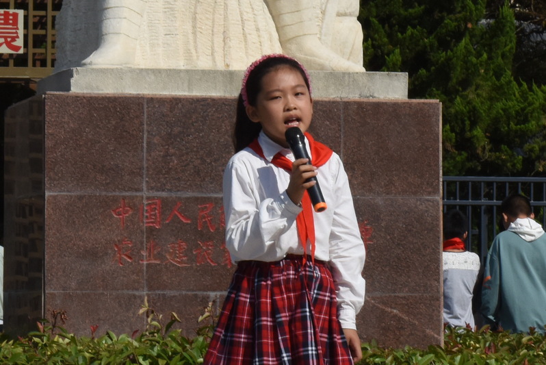 “各位同學,早上好,歡迎大家到我們農建四師陳列館參觀!我是淮海農場學校二年級學生于曉冉,也是我們陳列館的編外義務講解員,下面就由我來給大家介紹我們館的紀念碑白玉雕像……”928日上午,淮海農場小學二年級于曉冉,她作為農建四師的紅色小小講解員,開啟了為學校學生講述發生在農建四師軍墾傳統的紅色故事。