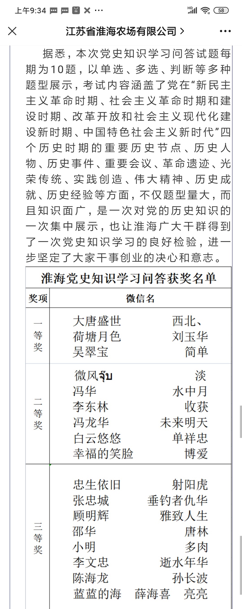 “作為農場老干部,我一直關注淮海農場的大事,這次為慶祝中國共產黨成立100周年大慶,農場黨委工作部去年6月1日通過微信公眾號發布的答題頁面進行答題活動時,我本著試試看的心理,第一次答題結束就獲得了100分,讓我的信心大增。”程定基在領獎名單上簽上自己的名字后興趣盎然地說,“于是在接下來的每周黨史知識學習問答試題,我都是認真對待,直到推出了26期淮海黨史學習教育知識問答全部結束。”