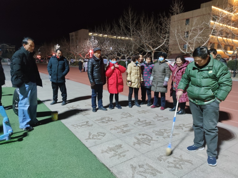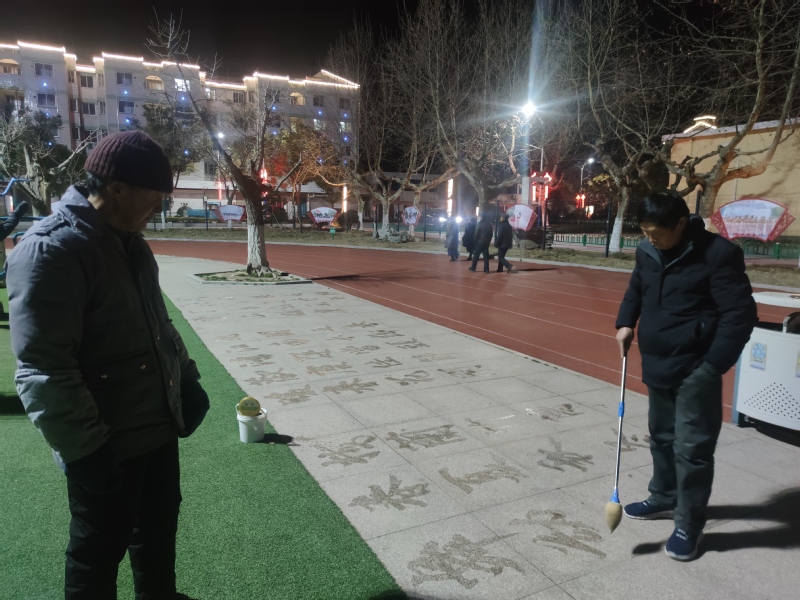 我們注意到,田海燕最喜歡書寫毛澤東的詩(shī)詞,讓偉人的詩(shī)詞再一次躍然紙上,讓大家見證下偉人詩(shī)歌的風(fēng)采魅力。田海燕有時(shí)用楷書書寫蘇軾的《水調(diào)歌頭》,展示出了不俗的書法風(fēng)格;有時(shí)他在書寫時(shí)嘴里一邊吟誦著一邊用楷書書寫,讓書法在研讀中更有韻味。夜幕下寫地書的鏡頭,也成為淮海職工休閑體育運(yùn)動(dòng)廣場(chǎng)中的一道亮麗風(fēng)景,增添了文化的藝術(shù)感染力。