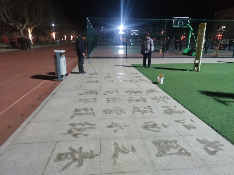 由于地面上的大理石成塊,這樣寫地書時(shí)剛好如同小時(shí)候我們臨摹稿紙上的一個(gè)個(gè)格子,一字一格,工整規(guī)范。又由于大理石平整光滑,便于筆在上面運(yùn)行,用水做的墨跡也只是在上面停留幾分鐘的光景,就慢慢隱褪即便是這樣,不僅書者可以怡情,鍛煉身心,而且過往者也可在駐足流連中欣賞,品味著藝術(shù)的魅力和詩(shī)詞中帶來的風(fēng)采