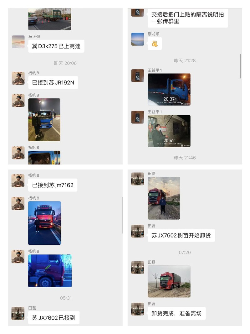 “冀D3k275已上高速”“已接到蘇JR192N”“空車回場,行程碼無星號,居家隔離”“蘇JX7602樹苗開始卸貨”……弶港農(nóng)場“疫”線黨員突擊隊微信群里的工作匯報內(nèi)容簡短,工作流程圖像清晰,值班人員和應(yīng)急小組24小時在線,全力為場域內(nèi)企業(yè)企業(yè)穩(wěn)產(chǎn)保供保駕護(hù)航。