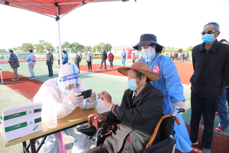 “請從這邊走!”轉業軍人、青年黨員孫強,標準軍人站姿導引著檢測居民有序進入,成為檢測中的一道風景。青年黨員趙珊、沈燕是一對好姐妹,由于連續的叫喊讓沈燕的嗓子嘶啞,今天她倆特意交換的分工。“這隊人少,請到這隊來!”接過好姐妹手中的大喇叭,趙珊大聲招呼著,將進入檢測區的居民有序分流到3個采樣區“你們在這里等我會兒,我先幫你們登記。”換成維護秩序后,沈燕時刻關注著檢測的人群。70歲的奶奶家住劉圩小區,獨自一個坐著電動輪椅來到劉圩居委會核酸采樣點。沈燕立刻上前引導她來到綠色通道,熱情地幫助她登記信息。5分鐘,奶奶完成了采樣。沈燕又小心地把她帶到了檢測出口。細心的黨員孫偉,在檢測中發現有不少行動不便的老人。今天他提前借來了一輛輪椅,看到年老體邁的老人,他就主動迎上去,把老人推進檢測綠色通道,從掃碼測溫到登記采樣,再到出口離開,最后把老人安全地交到老人家人手中。