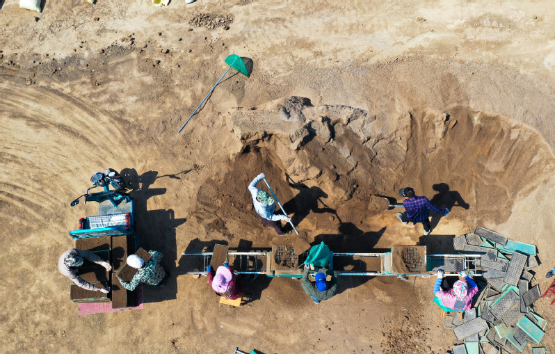 5月1日,寶應湖農場三分場場頭一派忙碌,擺盤、鏟土、倒稻種,7、8名工人分工合作,有序進行著落谷育秧。