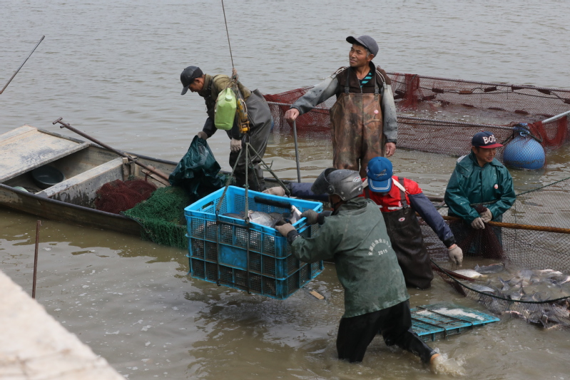 5月13日,寶應湖農場劉圩養殖場養殖戶楊金林正在起捕塘口鳊魚。