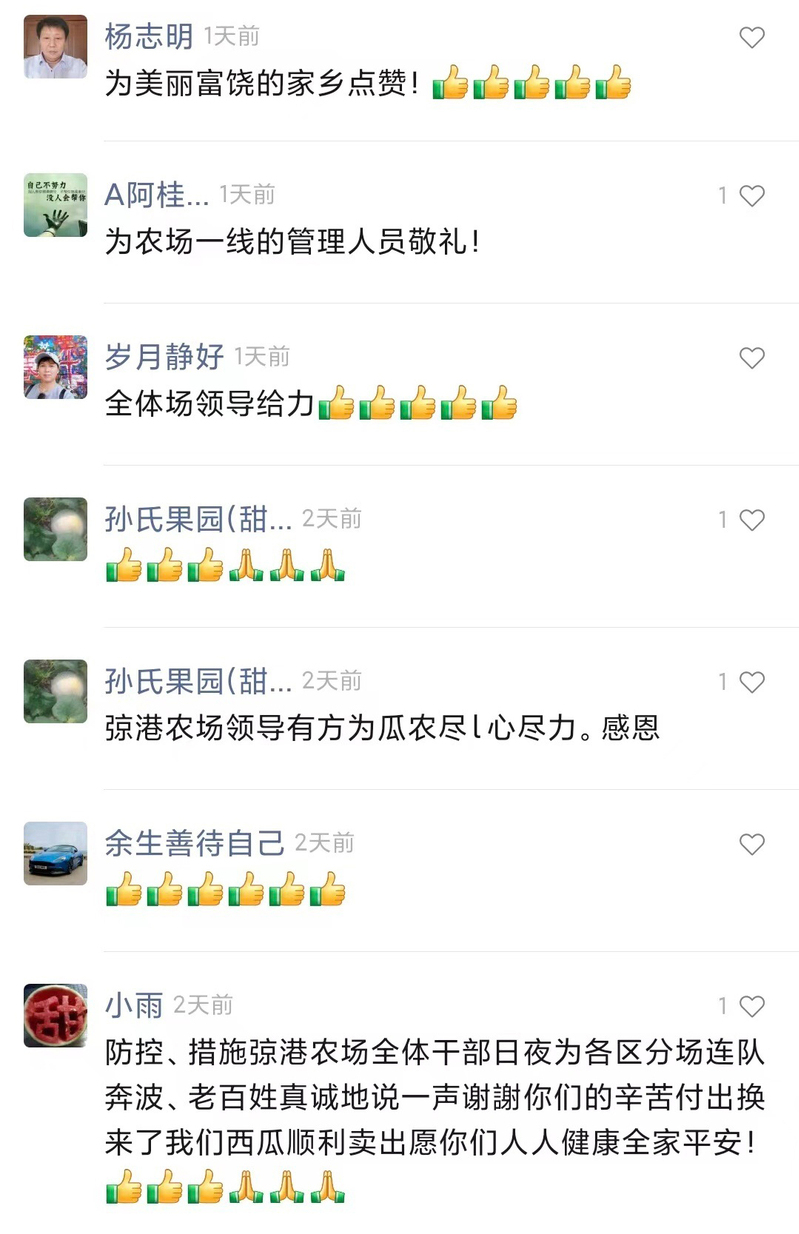 西瓜場來臨正值疫情防控形勢最嚴峻的時候,按照上級疫情防控要求,弶港農場黨委制定出防控西瓜運銷車輛閉環管理工作方案,成立西瓜運銷“疫”線指揮部,設立八個工作專班,近百人的西瓜閉環運銷隊伍,日夜奮戰,全程嚴密管控西瓜運銷貨車閉環管理,確保全國各地貨車開得進來,農場職工西瓜賣得出去。在這場戰役中,全場廣大黨員干部在抗“疫”一線“佩黨徽、亮身份、做表率”,以“一名黨員一面旗幟”的良好形象,全力以赴,吃苦在前、沖在一線,弶港農場2萬多噸“弶農”牌西瓜順利銷售。“美麗弶農”視頻號上反映西瓜運銷工作的小視頻,7千多次瀏覽量,幾百人點贊轉發,閉環運銷工作得到廣大職工群眾的一致稱贊,公司黨委書記胡廣斌在工作群中感嘆道“得到群眾的好評不容易”。