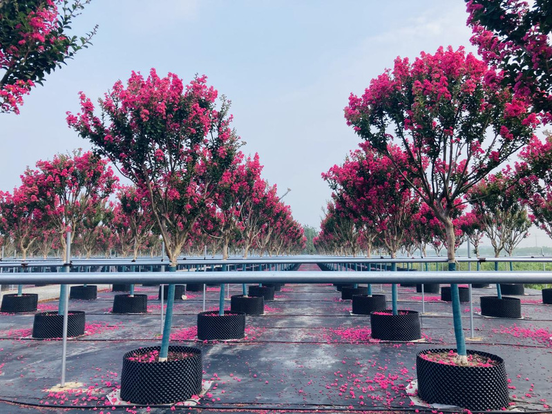 新洋林業公司容器苗三期當下正是一幅花開似霞的盛景,紫薇花團團簇簇掛滿枝頭,相當奪目。拳頭產品“四川紅”紫薇是農場公司黨委和林業公司4月份頂著疫情的壓力,積極爭取引進的產品,到了7月份便成為了附近居民的網紅打卡產品,獲得了居民們的一致好評和稱贊。其花期極長,從6月一直持續到10月,宋代楊萬里贊曰:“誰道花無紅百日,紫薇常放半年花?!泵鞔ピ娫疲骸白限遍_最久,爛漫十旬期。”因此,紫薇也有“百日紅”之稱。