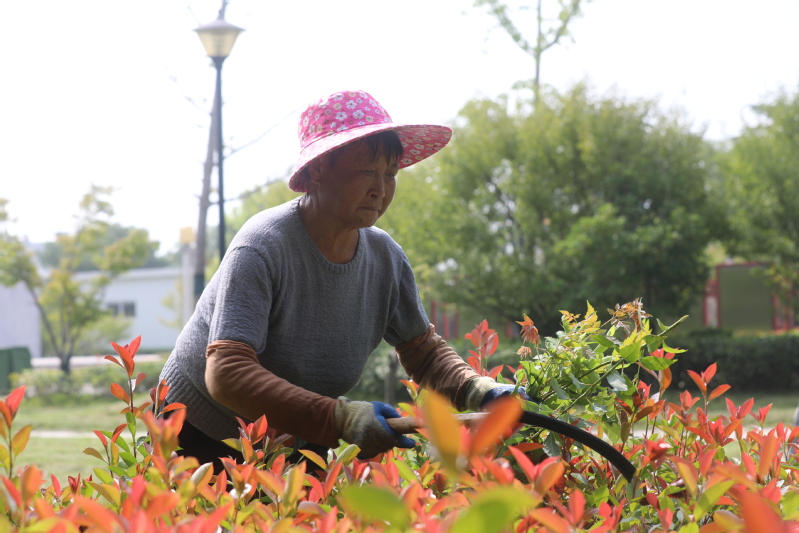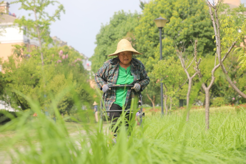 727日,寶應(yīng)湖農(nóng)場(chǎng)職工文化公園,7名工人正在為公園綠化除草。越是高溫雜草長(zhǎng)得越旺。以席正英為隊(duì)長(zhǎng)的綠化員們分工合作。草坪上用電動(dòng)切草機(jī)清理,隨著“隆隆”的機(jī)聲,切碎的草屑在刀頭間飛濺,濺到了工人的身上、飛上了工人的臉龐,刺癢刺癢,淡淡的青草味洋溢在夏日的晨光里。綠化帶里,爬騰類(lèi)的雜草枝枝蔓蔓,覆蓋的綠化樹(shù)上,工人們就用手先拉斷經(jīng)脈,再扯掉枝葉;低矮類(lèi)的雜草擁擠在綠化樹(shù)間,工人們蹲下身子就用手拔、用刀割。當(dāng)天7名工人清理綠化300多平方米。