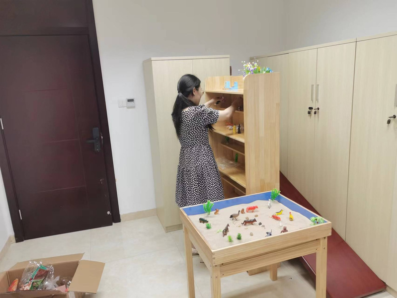 目前,淮海農(nóng)場社區(qū)民政辦正緊鑼密鼓的建立服務(wù)流程和日常管理需要的各類制度,建立健全困境兒童臺(tái)賬和活動(dòng)臺(tái)賬,預(yù)估10月底前,“淮海農(nóng)場未成年人保護(hù)站”的各項(xiàng)設(shè)施完善配置,并正式開放。圖為社區(qū)民政辦工作人員正布置心理咨詢室設(shè)施。