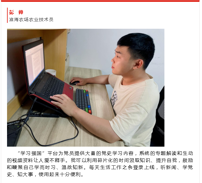 淮海各基層的黨員群眾堅(jiān)持每天打卡答題,積分你追我趕,大家的學(xué)習(xí)積極性高漲,實(shí)現(xiàn)了從“要我學(xué)”變“我要學(xué)”,從“被動學(xué)”變“主動學(xué)”的轉(zhuǎn)變。通過答題活動,進(jìn)一步加強(qiáng)了常態(tài)化制度化使用“學(xué)習(xí)強(qiáng)國”學(xué)習(xí)平臺,在互學(xué)互比中實(shí)現(xiàn)互進(jìn)互促。圖為彭帥在射陽宣傳第8期上的學(xué)習(xí)感悟。