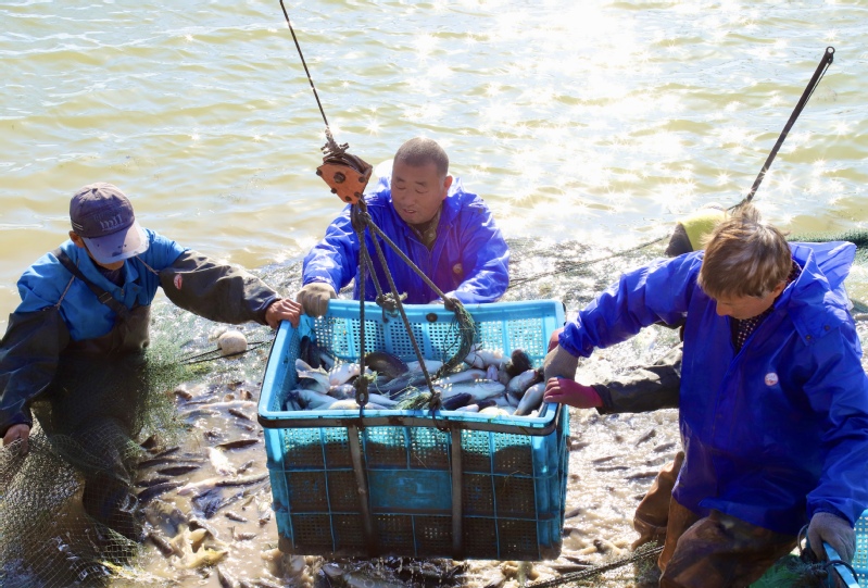 “起塘,出魚(yú)!”12月8日中午,在復(fù)興圩農(nóng)場(chǎng)有限公司鱸魚(yú)養(yǎng)殖園區(qū),集體養(yǎng)殖的加州鱸魚(yú)開(kāi)始清塘出售,十幾名漁業(yè)工人正拖著漁網(wǎng)在精養(yǎng)魚(yú)塘里沿著塘口邊拖網(wǎng)捕魚(yú),隨著漁網(wǎng)不斷收攏,成千上萬(wàn)條鱸魚(yú)翻騰出水面,掀起陣陣?yán)嘶ā?