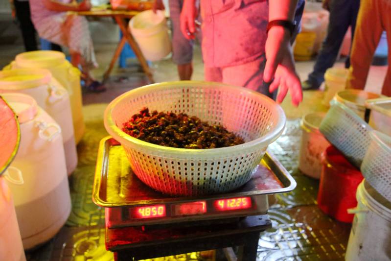 夏夜暑熱退去,新曹農場河邊林帶、國道兩側、集鎮周邊,小樹林里經常光影搖曳、星星點點,人們拿著手電筒等照明裝備仔細在每棵樹上尋摸,只為找到獨屬夏季的舌尖美味——金蟬。老百姓熱衷抓蟬、吃蟬,價格由最初的每只0.3元到如今的每只1元左右,10年內小小金蟬身價翻了3倍,一躍成為新的致富“頂流”?!敖鹣s捕捉高峰期能有20多天,一家人一晚可以捉1000多元,每年靠捉金蟬就有近2萬元的收益,我們這一個點一晚收購數量在5000斤以上,平均價每斤90元以上,年產值900萬元。”金蟬收購點老板何成剛說。