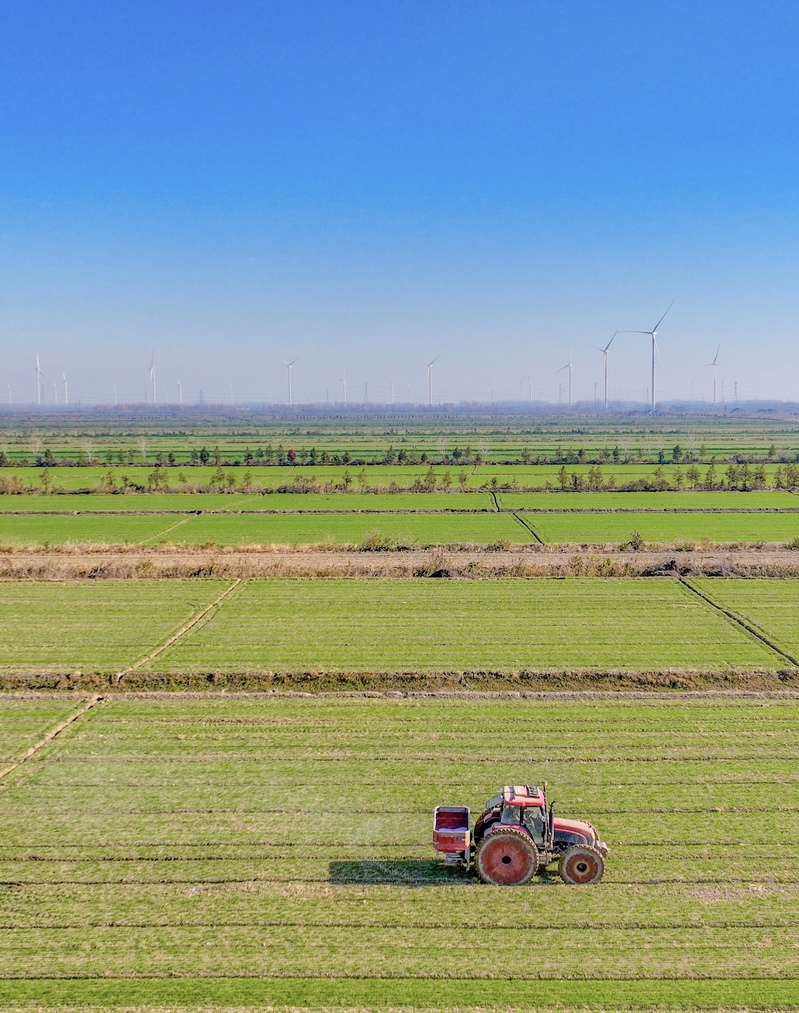12月9日,江蘇省鹽城市射陽縣的一座農場內,農機正在進行田間管理作業。入冬以來,農場搶抓晴好天氣,實施綜合田管,為夏糧增產豐收打好基礎。張偉生攝(中經視覺)