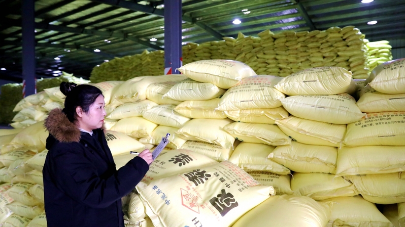 2月6日,蘇墾農服東辛分公司倉儲中心內,倉庫保管員正在清點春耕農資,為春耕做好儲備。