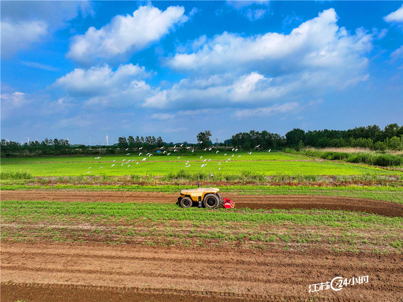 江蘇24小時|圖片新聞:寶應湖農場國產無人拖拉機引鷺鳥圍觀