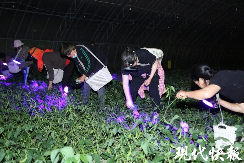 “搜尋時一定要仔細,左右兩邊都得留意,才能把豆丹抓全?!眴误w2號大棚的豆丹養殖負責人李加祥一邊熟練地捕捉豆丹,一邊向工作人員傳授經驗,“豆丹和豆葉顏色相近,白天捕捉極易遺漏。但到了夜間,紫光燈一照,豆丹就像會發光的螢火蟲,清晰可見,不僅抓捕效率高,還能做到顆粒歸倉?!睘榇_保此次捕捉行動順利開展,園區提前規劃,從人員調配到工具準備,每一個環節都精心部署,為高效捕捉打下堅實基礎。