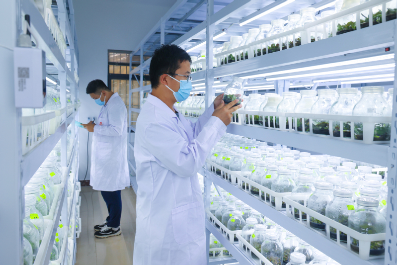在江蘇農墾云臺農場的蝴蝶蘭培養室里,培養架上排列著一瓶瓶嫩綠的幼苗。通過精準調控光照波長、濕度梯度和營養配方,不僅可以縮短蝴蝶蘭育苗周期,還能顯著提高苗子的成活率和抗病性。圖為技術人員在開展日常蝴蝶蘭幼苗培育觀測工作,并同步系統記錄生長數據及環境調控參數。