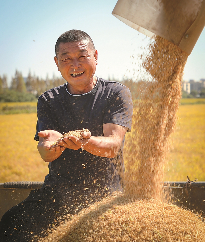 10月10日,南通市海門區,江蘇農墾江心沙農場500余畝“低GI”功能性水稻喜迎豐收。