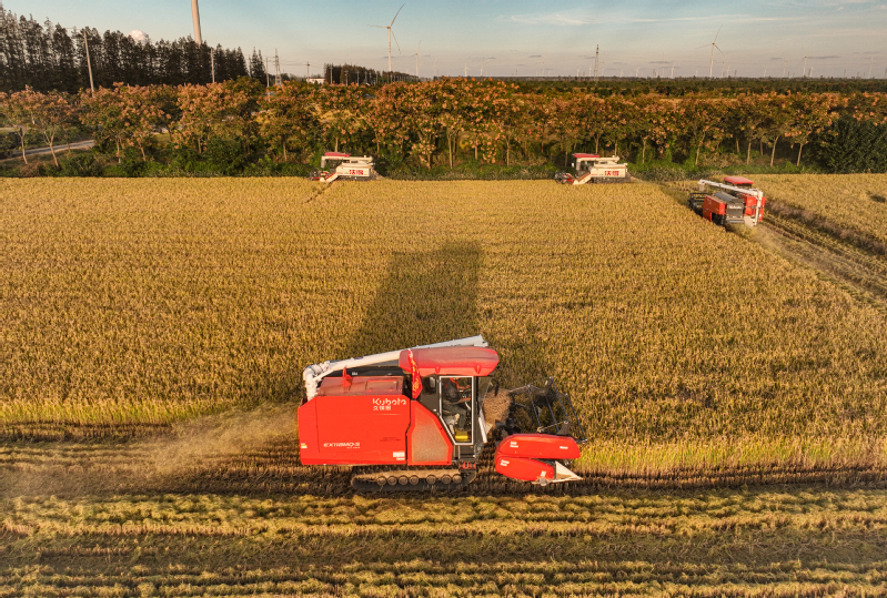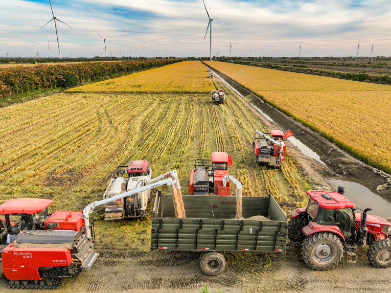 11月3日,江蘇省鹽城市射陽縣新洋農場組織收割機械,對高標準農田中的優質水稻進行搶收作業,確保秋糧顆粒歸倉,不誤農時。 作者:張偉生