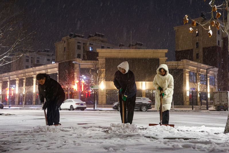 2月4日,連云港再降大雪,云臺農場部分地區積雪嚴重。云臺農場公司黨委迅速反應、精準發力,立即啟動暴雪天氣應急預案,積極組織華泰物業公司,農場社區城管隊、各居委會網格員等形成志愿小組,即刻開展“清除道路積雪 保障通行安全”行動,各單位、部門迎雪而上,全力以赴保障場域居民群眾出行安全。在清雪過程中,采取“人工+機械”方式進行清除,有的在場域內主次干道,使用鏟雪車、撒鹽車,有序配合;有的拿著鐵鍬、掃帚等清雪工具,手動鏟雪,并用盆潑灑融雪劑,清理雪泥積水,清運的隊伍浩浩蕩蕩。冰冷的雪花飄下,刺骨的寒風吹在志愿者的臉上、手上,可志愿者們不顧嚴寒,個個干的熱火朝天,掀起了一波清雪“大作戰”。“小心地滑,大家一定要注意自身安全?!薄靶逼鲁┮欢ㄒ⒁猓P注一下往來的車輛?!敝驹刚叽捩面煤暗馈!拔覀冎幌氡M快保障通暢出行,確保居民們的安全?!敝驹刚唠鴤ゴ謿飧嬖V筆者。志愿者們克服惡劣天氣等不利因素帶來的影響,對場域內公共區域進行連續作業,最大限度保障居民安全出行,不畏嚴寒、不怕辛苦,以昂揚的精神面貌繼續奮戰在除雪保暢一行。