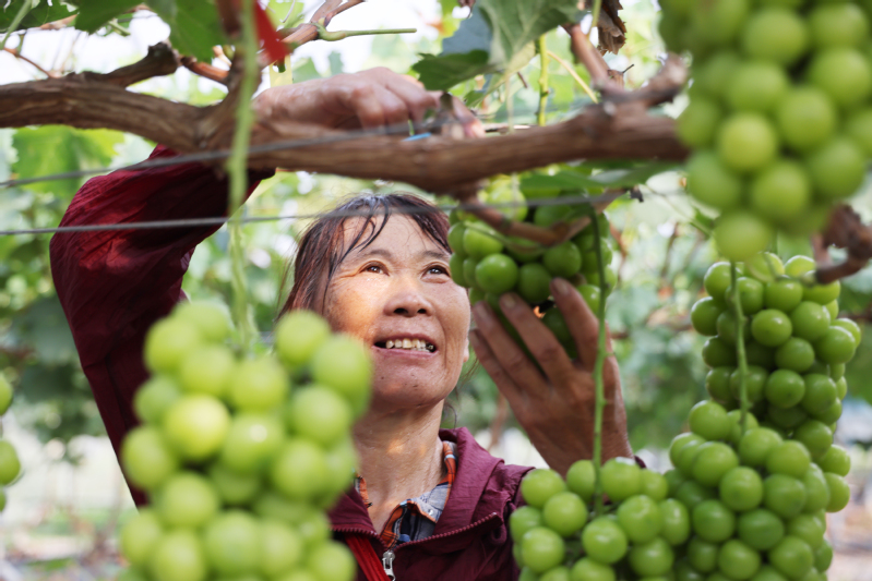 云臺農場公司依托良好區域生態優勢,積極發展生態休閑農業,促進農旅融合發展。圖為8月19日,職工在云水灣濕地公園采摘葡萄。據悉,該場栽植鋼架大棚葡萄55畝,畝產最高達2700斤。