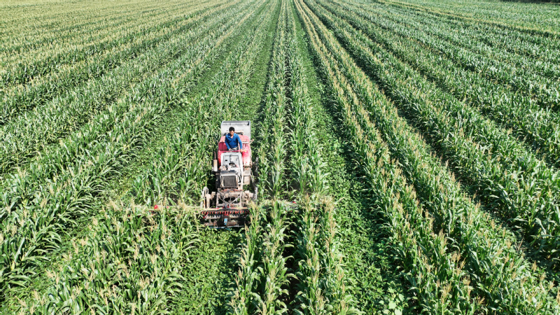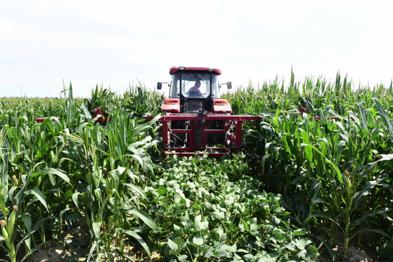 玉米雄穗剛露頭尚未開花散粉時進行去頂(去掉玉米雄穗),既能讓玉米提前成熟3-5天,又可以使玉米籽粒灌漿相對集中、減少養分消耗,可以降低株高防風防倒,改善玉米基部及行間大豆光照積累,減少穗部易患玉米螟、蚜蟲等害蟲的危害,從而達到增產的目的。蘇墾農發淮海分公司通過引進2臺玉米切頂機,對5000多畝玉米大豆帶狀復合種植田間的玉米雄穗進行切頂作業,據悉,每臺機械每天可以作業200畝,極大地提升了工作效率。圖為8月16日,淮海分公司運用大機械在玉米大豆帶狀復合種植田間對玉米雄穗進行切頂作業。