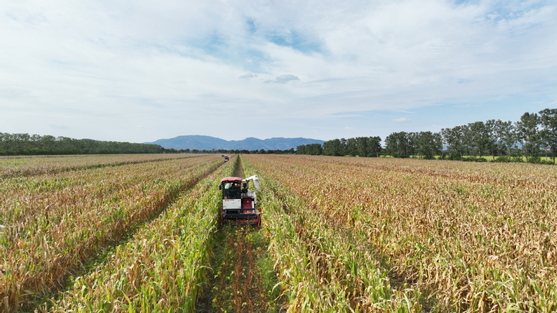 今年江蘇農墾大豆玉米帶狀復合種植面積達12萬畝,目前大豆玉米已經陸續成熟。圖為蘇墾農發東辛分公司農機在田間收割大豆。