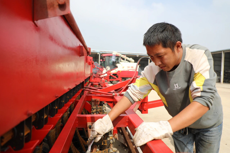 “小朱,這根皮帶松了,咱們一起給調一下,要不然到時候容易脫落,耽誤收割。”9月20日,在蘇墾農發崗埠分公司農機總站,農機檢修人員羅軍正和朱玉保兩位同志一起,給大豆收割機進行檢修維護。在現場,21臺大豆收割機洗刷一新,整齊排列著,顯得氣勢非凡。為了備戰即將到來的“三秋”,連日來,農機總站積極組織人員對各類機械進行維修保養。“針對大豆收割機輸糧器容易堵塞的問題,我們請廠家到現場進行了檢查,并根據建議進行了改造。同時,對機油、線路、水箱等進行了詳細檢查,確保機器運行正常。”農機總站站長張猛表示。不遠處,兩名工人正在給農機更換輪轂。“這類農機之前是用來在玉米大豆地里中耕、化除和去雄作業的,使用的是窄輪胎,現在更換寬一點的輪胎,方便農機在場頭翻曬糧食和麥田開溝。”工人們說道。崗埠分公司農機總站高度重視農機農具檢修保養工作,自三夏大忙結束,農機總站立即開展維修保養工作,多次組織農機廠家技術員、農機作業組及維修保養專業人員,對農機總站的收割機、播種機、撒肥機、開溝機等進行了全面檢修保養和調試,確保各式農機器械“三秋”拉得出、打得響、干得棒。“除了常規保養檢修機械,我們還進一步加強農機社會化服務工作,
